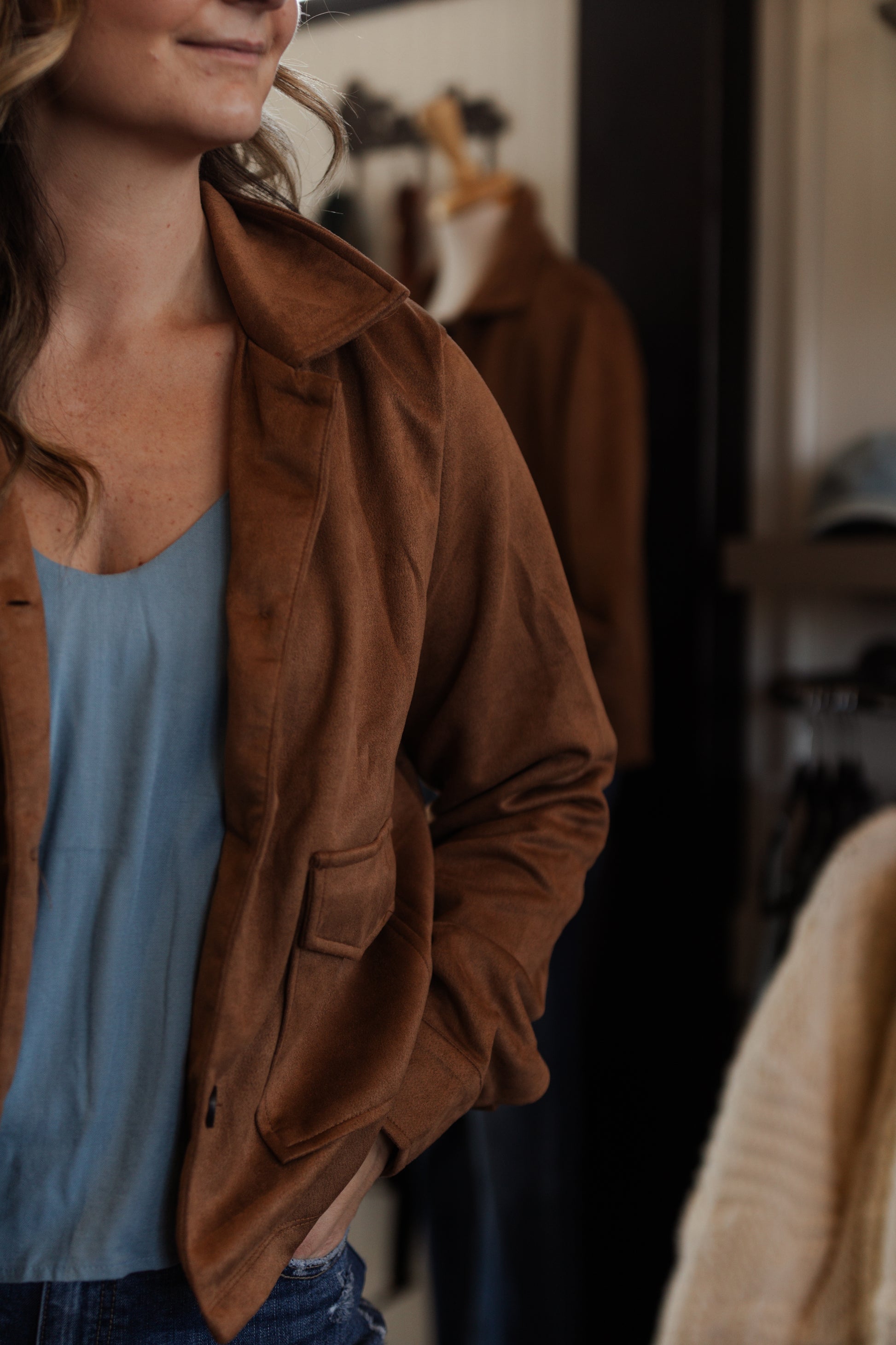 The Amelia Tailored Suede Jacket has a classic collar and button-front closure stands out for its simplicity and elegance. Designed with two structured patch pockets, it offers both style and practicality, making it ideal for versatile wardrobe combinations. Wear it over a crisp white shirt and tailored pants for a smart look, or pair it with jeans for a casual day out.