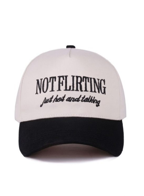 This two-tone baseball cap combines classic style with a modern edge, featuring a bold "Not Flirting" design. Crafted for comfort and durability, it offers an adjustable fit perfect for everyday wear. Ideal for those seeking a subtle, confident statement piece without compromising on quality.
