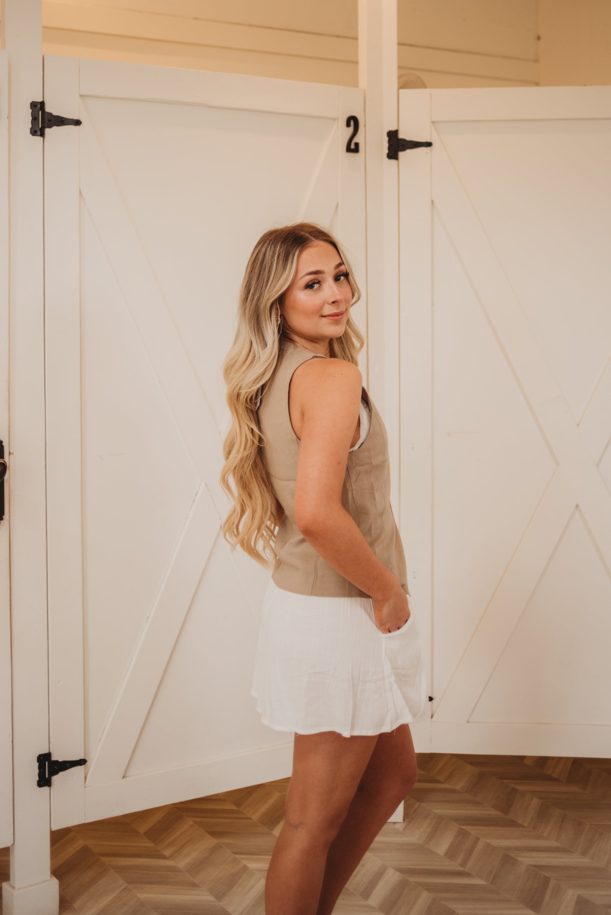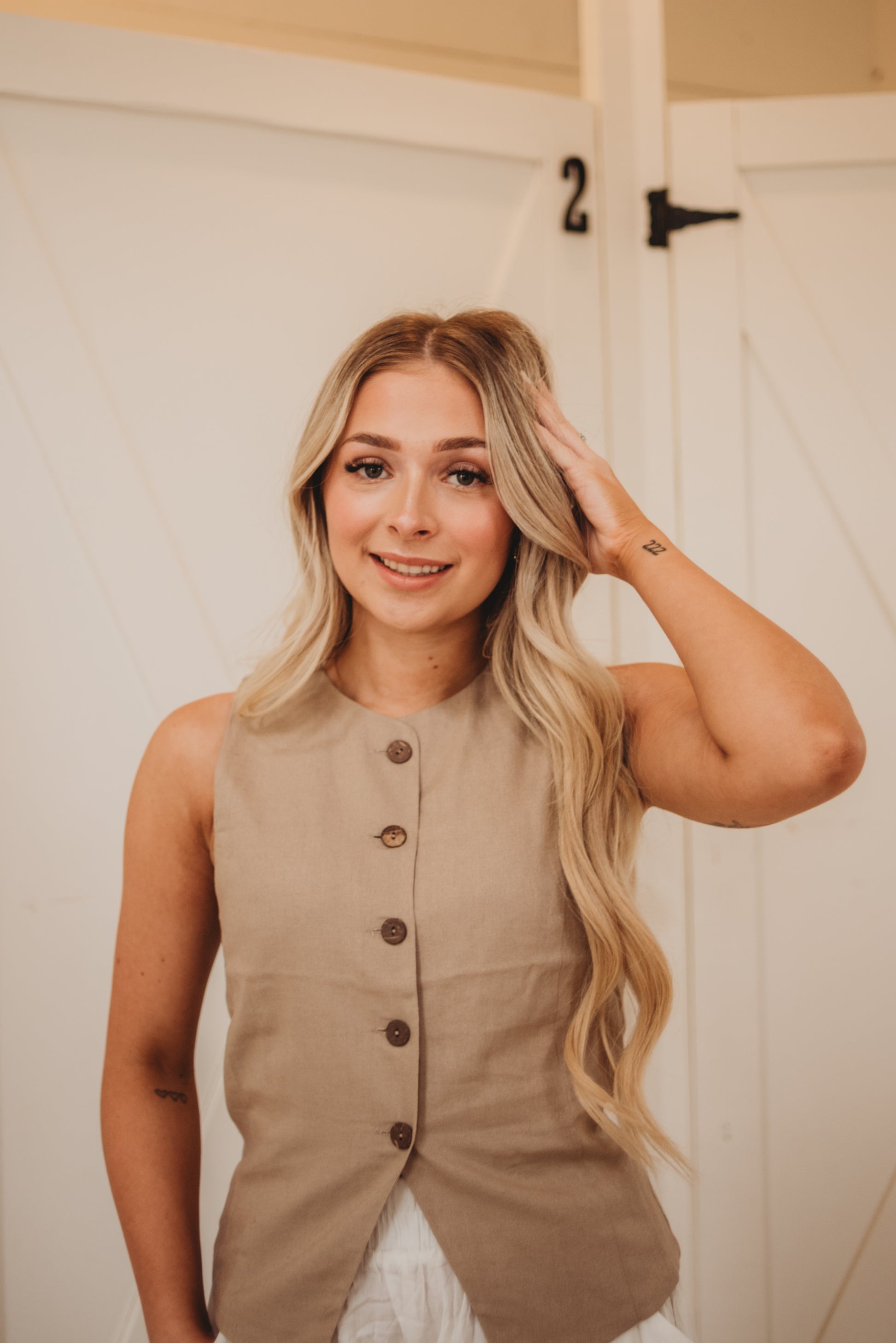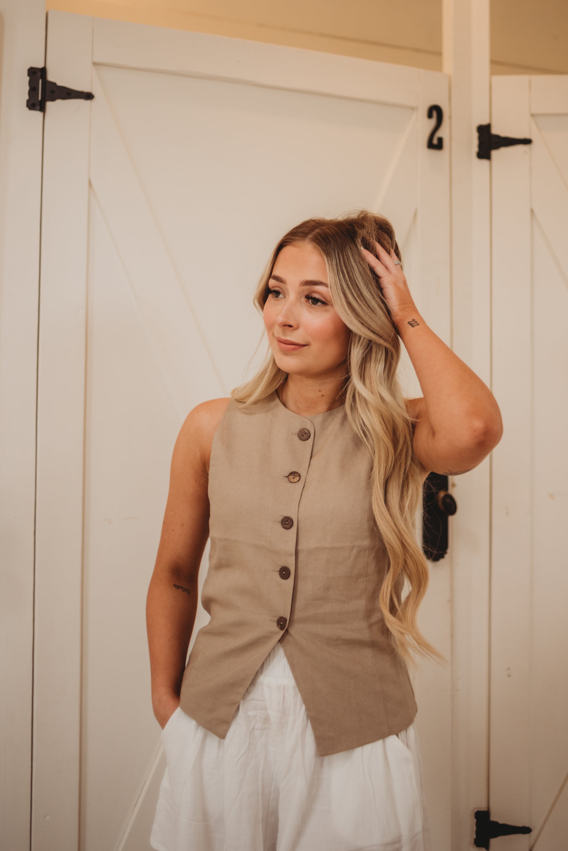 The Jaclyn Linen Button Vest combines a lightweight design with stylish button details, making it a versatile layering piece for any wardrobe. Featuring a sleeveless cut and a neutral color, it pairs effortlessly with various outfits for different occasions. Crafted from a breathable linen blend, this vest is perfect for staying comfortable and chic year-round.