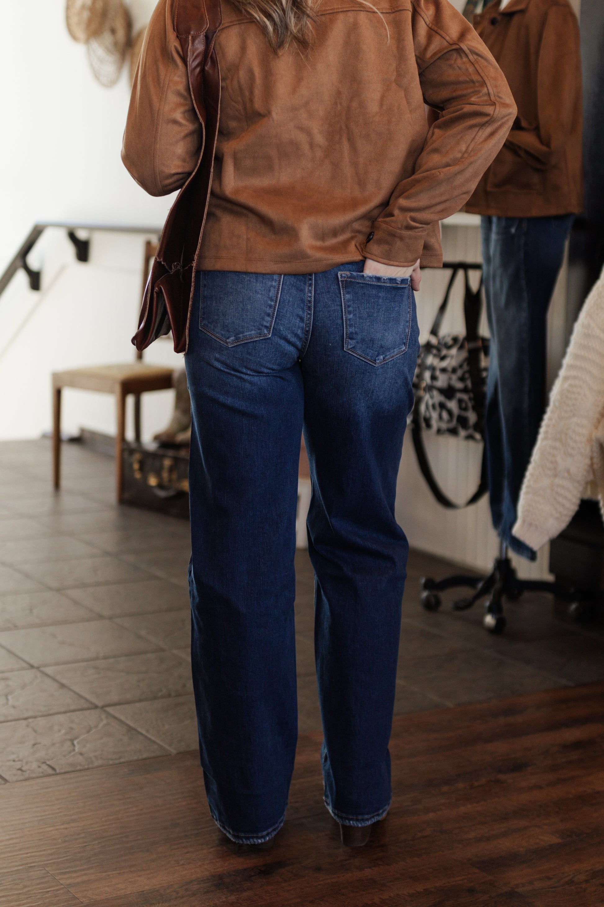 These mid-rise wide-leg jeans feature a dark wash with stretch fabric for comfortable wear. Designed with a classic five-pocket style and zipper fly, they include subtle light distressing and a 1/2" regular hem with heavy grinding details. The rise measures 9 1/2" with a 31" inseam in size 5/26.