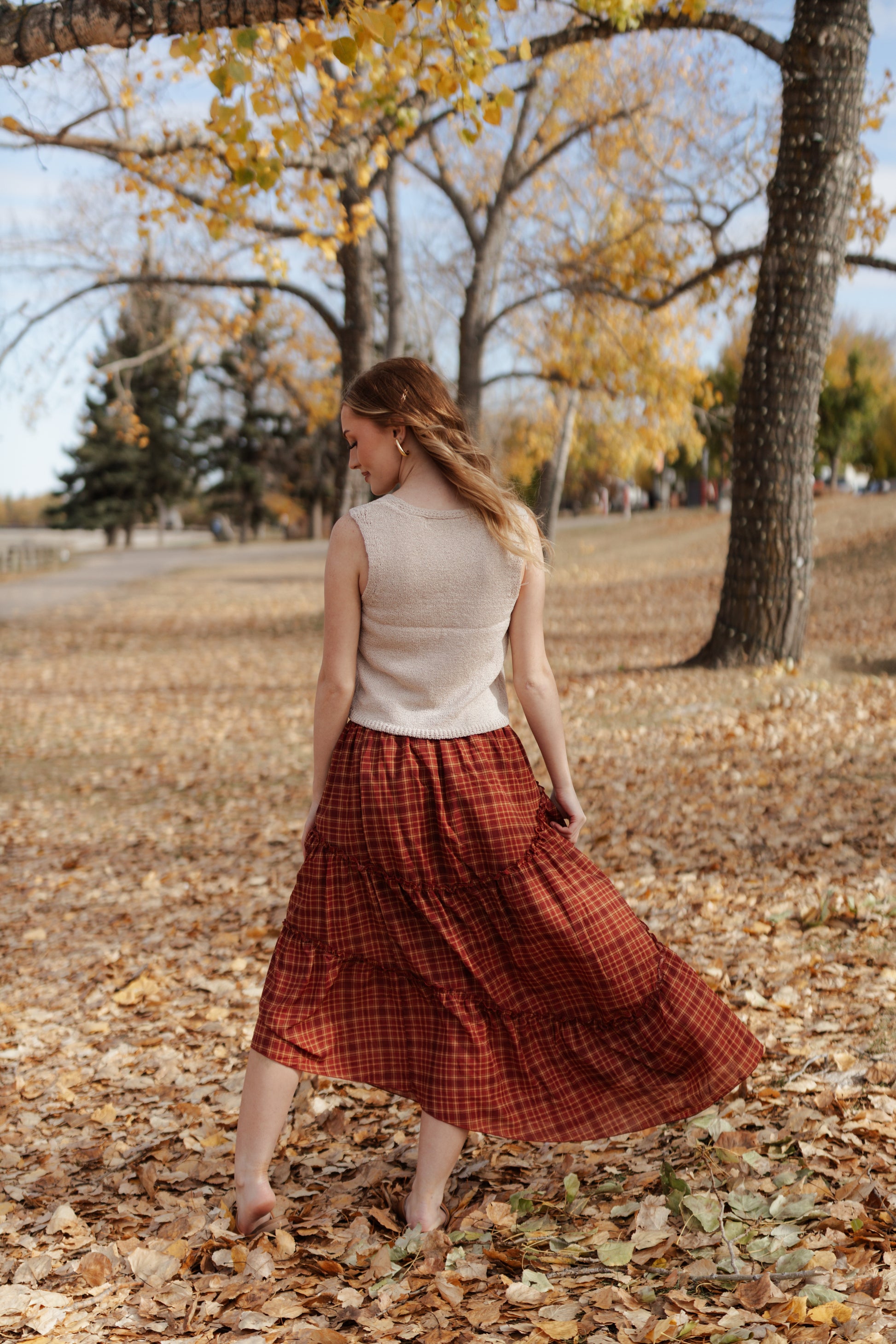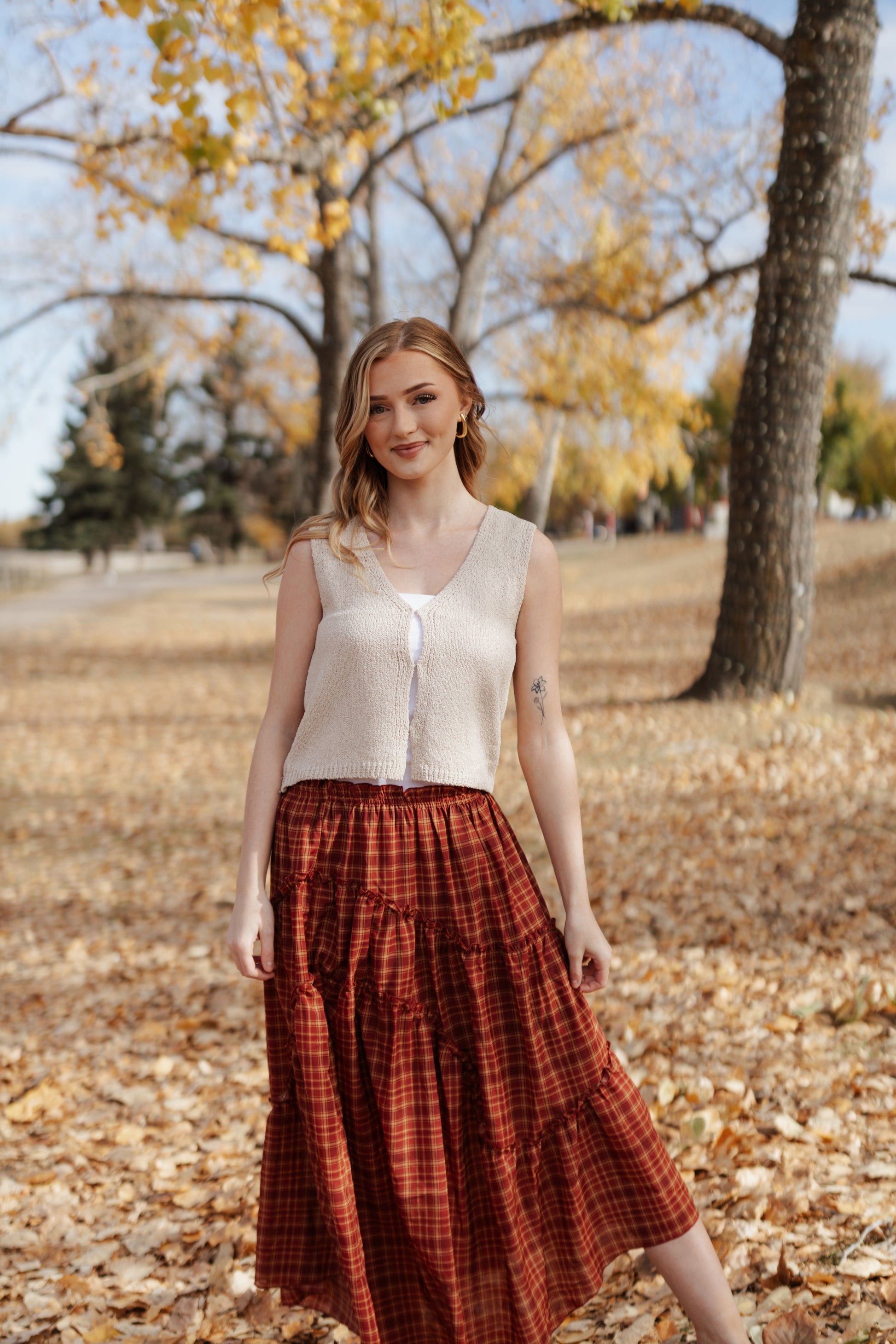 The Lucy Knit Vest in Sand Beige features a soft knit fabric with a flattering V-neck and three front hook and eye closures. This versatile sweater vest combines comfort with fall-ready style, making it an essential layering piece for cooler days.