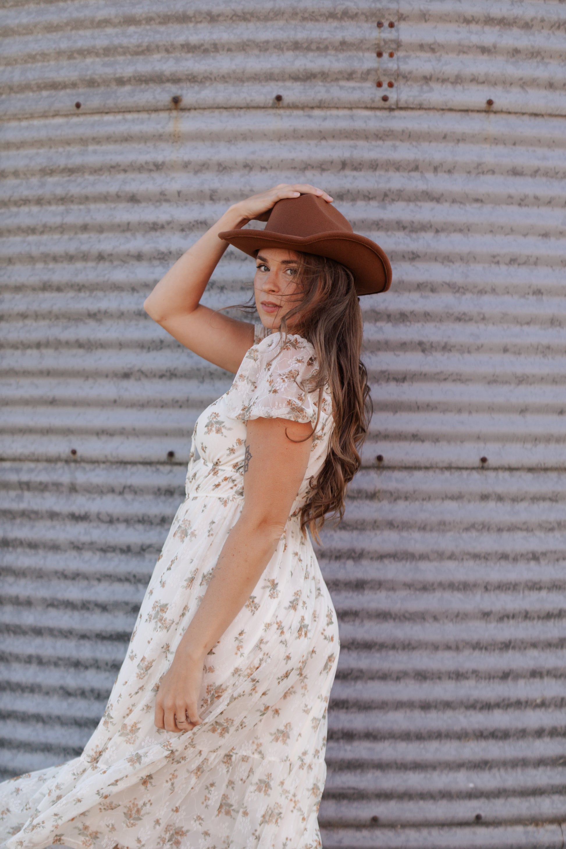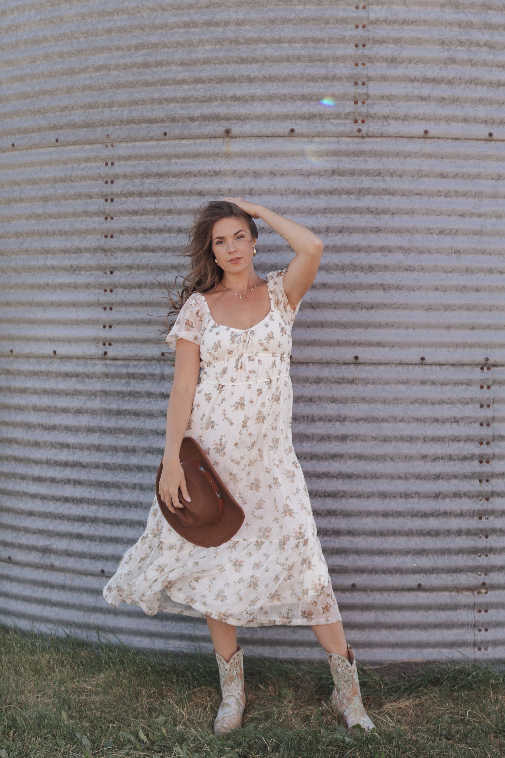The Rebecca Floral Puff Sleeve Dress features a sweetheart neckline and short puff sleeves, offering a delicate and feminine silhouette. Its ruched waist and front tie detail enhance the fit, while the sheer floral pattern adds subtle elegance. Fully lined, this midi dress combines comfort with style, making it an expert choice for refined occasions.